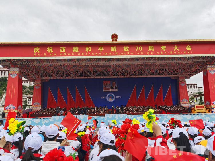 上午10時(shí),齊扎拉宣布大會(huì)開始。全場(chǎng)起立,奏唱國(guó)歌,鮮艷的五星紅旗在布達(dá)拉宮廣場(chǎng)冉冉升起。在熱烈的掌聲中,尤權(quán)宣讀了中共中央、全國(guó)人大常委會(huì)、國(guó)務(wù)院、全國(guó)政協(xié)、中央軍委關(guān)于慶祝西藏和平解放70周年的賀電。