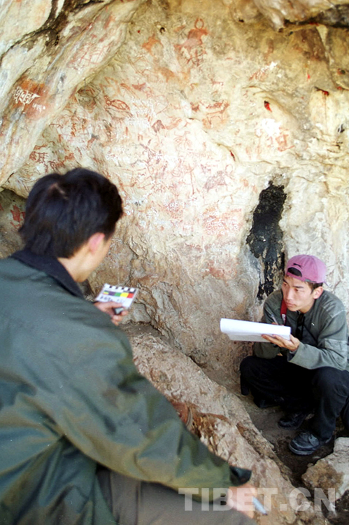 這是藏北無人區(qū)科考團科考人員在對班戈縣洞窟巖畫進行科學考察(唐召明2001年攝)
