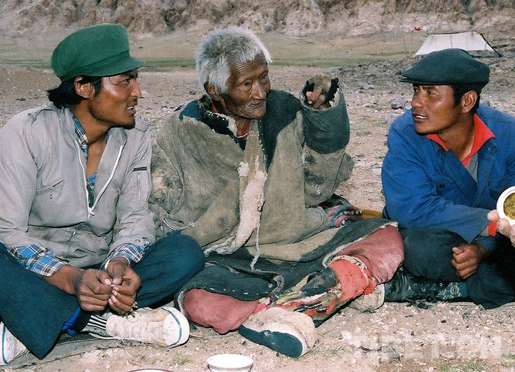 老人說我是遠(yuǎn)方來的客人,盡管是第一次見面,也非要拉我們?nèi)ニ业膸づ褡隹筒豢?。接過我遞過去的香煙,老人連連說:“吐基其,吐基其(謝謝)!”趁他和畜牧局干部交談,我悄悄地拿起身邊的照相機(jī),但我的舉動(dòng)還是被老人發(fā)現(xiàn)了。他將那袒露在外面的臂膀套進(jìn)皮袍里,笑容滿面地直視我的鏡頭,讓干部邊巴告訴我:“我要拍張笑的照片,要讓人們知道羌塘有位生活非常幸福的老壽星?!闭f完,他像頑童一樣哈哈大笑……