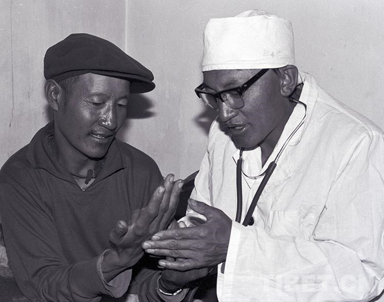 這是文部辦事處(現(xiàn)尼瑪縣)衛(wèi)生院院長(zhǎng)羅桑多吉正在為牧民患者診治疾?。ㄌ普倜?987年攝)