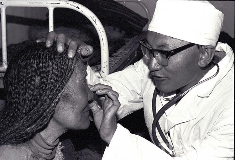 這是文部辦事處(現(xiàn)尼瑪縣)衛(wèi)生院院長(zhǎng)羅桑多吉正在為住院牧民患者診治眼睛疾?。ㄌ普倜?987年攝)