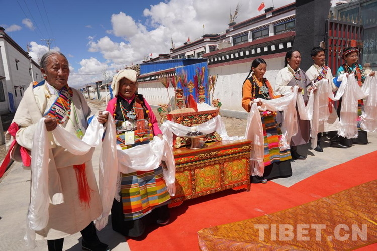 位于薩迦縣扯休鄉(xiāng)東北部的嘎吉林村,是庫區(qū)搬遷新村,2020年3月,全村139戶769人從海拔4000多米的土坯房搬遷到了這里海拔3800米的新房。得知班禪要來的喜訊,嘎吉林村村民及信教群眾身著節(jié)日盛裝、手捧潔白哈達(dá),一早就自發(fā)聚集在村廣場上迎候班禪。村民旦珍高興地對記者說道:“自從搬到這兒以后,政府給我們每人分了5.5畝田地,每戶人家都享受著國家搬遷優(yōu)惠政策,住上了福利幸福房。尤其是有了村里的集體合作社,再也不用像以前那樣單打獨(dú)斗各家做各自的事了?,F(xiàn)如今,無論是生活還是經(jīng)濟(jì)收入都一年比一年好?!?/p>