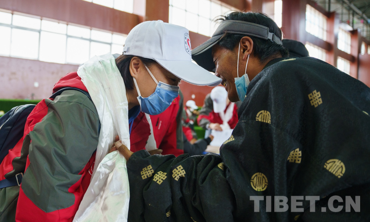 圖為嘎瑪措姆家鄉(xiāng)群眾向郭梅(左)敬獻哈達 攝影:趙耀