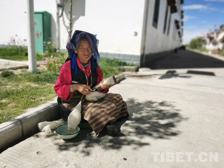 坐在自家門前樹下的尼瑪老奶奶,一邊黏線,見著我們高興地說?!白园徇w到這兒,住房生活環(huán)境太好了,去哪兒哪兒都方便,孩子們?cè)谧约议T口就找到了工作,和以前相比生活好得太多了?!?/p>