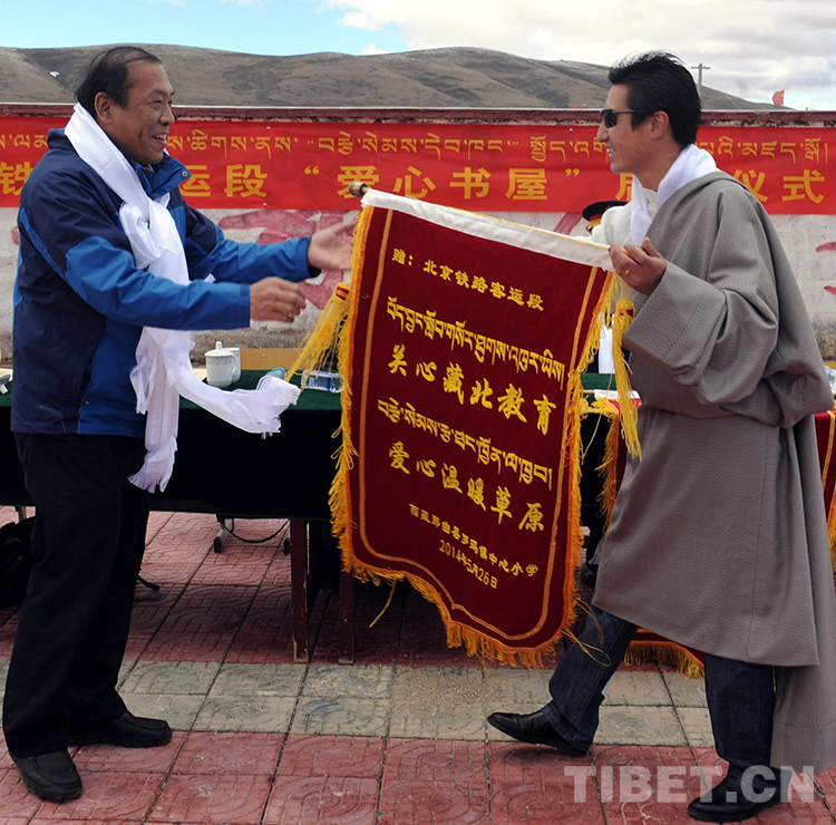 這是西藏那曲地區(qū)那曲縣(現(xiàn)那曲市色尼區(qū))羅瑪鎮(zhèn)中心小學(xué)校長拉巴格桑(右)代表學(xué)校向北京鐵路客運(yùn)段代表王博軒(左)贈(zèng)送錦旗(唐召明2014年5月29日攝)