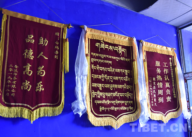 圖為白瑪赤列的勞務(wù)派遣公司里大家贈送的錦旗 攝影:王媛媛