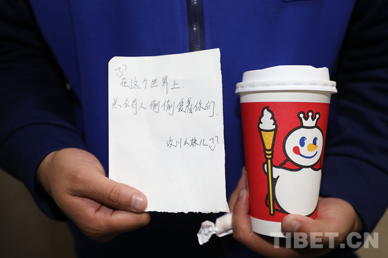 抱著這個(gè)還有溫度的大箱子,楊文武趕緊報(bào)告了指導(dǎo)員楊路路。打開箱子后,發(fā)現(xiàn)是整整齊齊60杯熱騰騰的奶茶。茶杯上留著一張小紙條,寫著“在這個(gè)世界上,總會(huì)有人偷偷愛(ài)著你們”,落款人“汶川幺妹兒”。指導(dǎo)員和楊文武恍然大悟,肯定是一位熱心的女孩匿名買了奶茶,又讓這對(duì)外賣夫婦送過(guò)來(lái)的。只是不知道是哪位暖心的女孩送了奶茶,因?yàn)闆](méi)有留下任何聯(lián)系方式,也沒(méi)有透露自己的真實(shí)姓名。