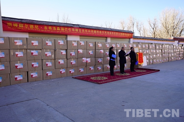 捐贈(zèng)儀式上,雙湖縣副縣長(zhǎng)普珍和農(nóng)業(yè)農(nóng)村局局長(zhǎng)次仁達(dá)瓦代表雙湖縣縣委、縣政府和廣大基層牧民群眾接受捐贈(zèng)并向班禪表示感謝。