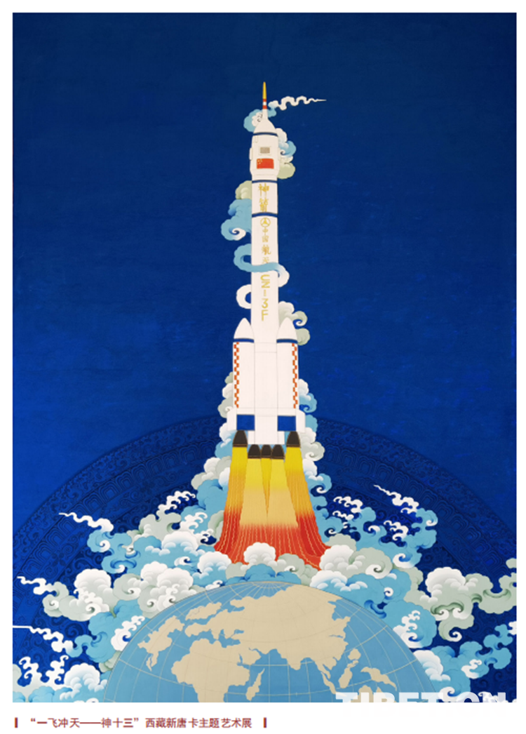 唐卡藝術(shù)家邊巴的新唐卡作品《一飛沖天》,以神舟十三號為主題,描繪了飛船沖出地球奔向星辰大海的瞬間。飛船、地球、祥云的后面,有一個融入背景的曼荼羅圖案,象征著西藏傳統(tǒng)的宇宙觀。傳統(tǒng)地道的勉唐派唐卡繪畫語言,采自天然礦物富有環(huán)保特征的厚實(shí)顏色,漢藏融合的審美品位,立足中國放眼世界的人類命運(yùn)共同體胸懷,正是新時代新唐卡新融合的藝術(shù)表達(dá)。