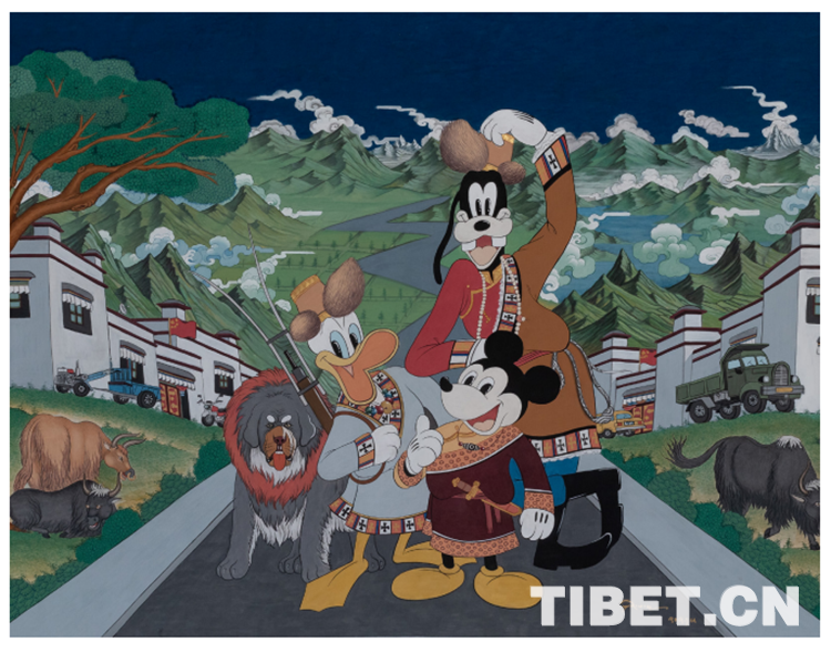 唐卡藝術(shù)家邊巴的新唐卡《逛新城》,同樣的青山綠水,同樣的社會主義新農(nóng)村,不同的是,他讓米老鼠和唐老鴨穿上藏裝來做客了。隨著拉薩近年來的城市巨變,知名企業(yè)、品牌進(jìn)駐城市,也以獨(dú)特的風(fēng)格資源和自身亮點(diǎn)成為旅游勝地,一個嶄新而充滿活力的現(xiàn)代化拉薩正在崛起。作品在傳統(tǒng)與現(xiàn)代之間所傳遞的沖撞與融合,展現(xiàn)的自信與從容,正是中華文化的主流價值所在。