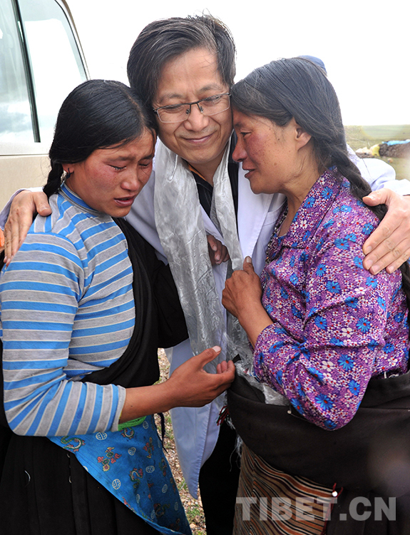 這是曾為斯求卓瑪進行手術(shù)的北京口腔醫(yī)院口腔頜面外科主任韓正學來到西藏自治區(qū)那曲市班戈縣新吉鄉(xiāng),在為斯求卓瑪作術(shù)后檢查時,卓瑪母女倆奔向韓正學懷抱相擁而泣(唐召明2015年7月14日攝)