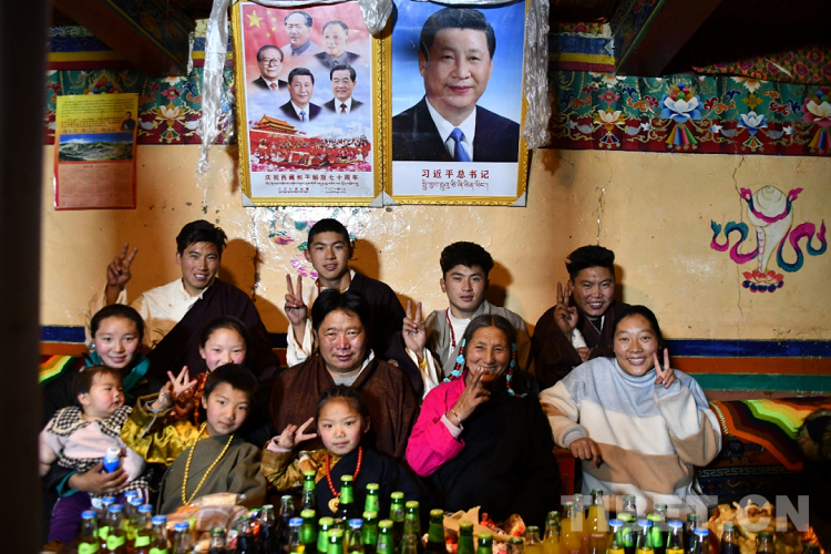 “尼瑪,拉姆,快過來獻(xiàn)哈達(dá)了!”索朗仁青一邊招呼著自己的孫子、孫女,一邊整理著手中的哈達(dá)?!跋蝾I(lǐng)袖獻(xiàn)哈達(dá)是我們家每年不變的傳統(tǒng),我們永遠(yuǎn)感謝偉大領(lǐng)袖,感謝共產(chǎn)黨?!彼骼嗜是嘁患仪f嚴(yán)面向墻上懸掛的領(lǐng)袖像,高舉哈達(dá),齊聲祝福:“扎西德勒!”
