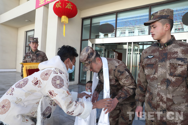 圖為兒童家長為官兵獻(xiàn)上哈達(dá)