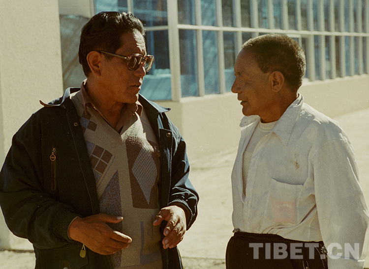 這是原雙湖辦事處首任書記,后任那曲地委(現(xiàn)那曲市)書記、西藏人大常委會副主任等職的洛桑丹珍(左)在申扎縣調(diào)研時與當?shù)乩细刹窟M行交流(唐召明2001年攝)
