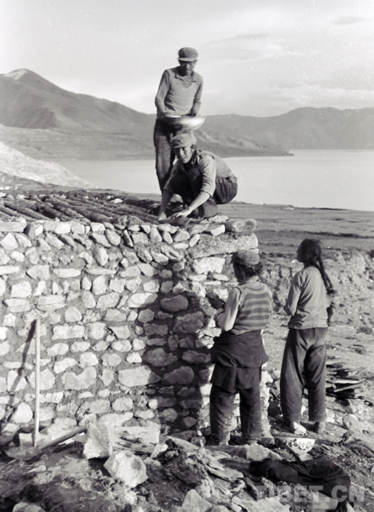 這是文部辦事處文部區(qū)文部鄉(xiāng)(現(xiàn)尼瑪縣文部鄉(xiāng)南村)的村民在當(dāng)惹雍錯湖畔蓋石屋(唐召明1987年攝)