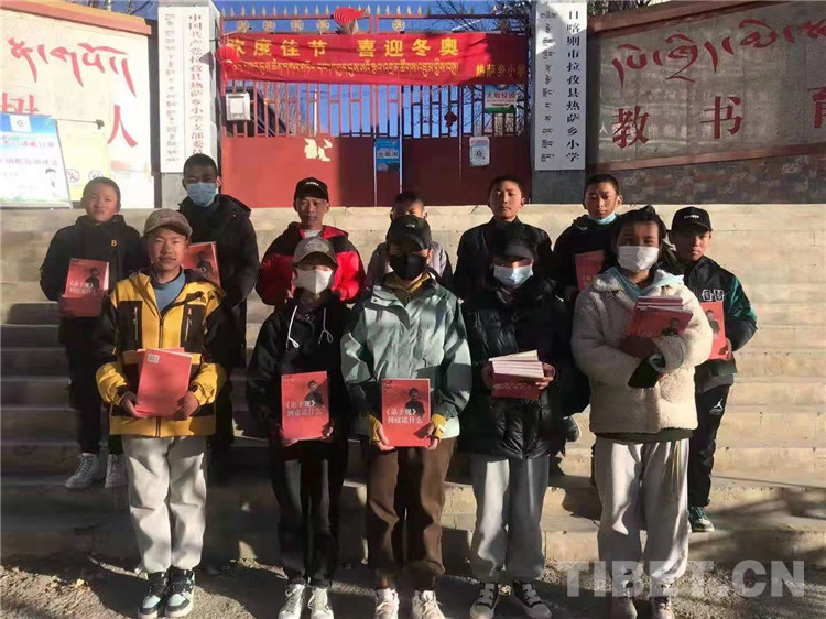 圖為拉孜縣熱薩鄉(xiāng)小學(xué)學(xué)生展示受捐圖書
