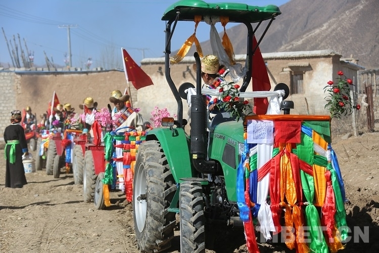 “轟隆隆、轟隆隆......”在墨竹工卡縣唐加鄉(xiāng)東布崗村,一早,村民們便聚集在一起。經(jīng)過一系列祈愿豐收的傳統(tǒng)儀式后,大家便駕駛自家的農(nóng)用機(jī)械開始了勞作。數(shù)十輛裝扮一新的農(nóng)用機(jī)械宛如一條“長龍”在田間來回穿梭,轟鳴聲響徹山谷之間。秋日豐收的喜悅場景已浮現(xiàn)在所有人的腦海中。