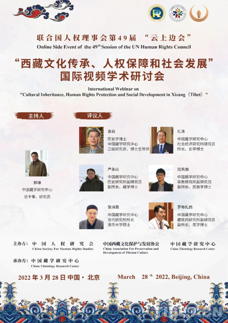中國西藏網(wǎng)訊 3月28日,聯(lián)合國人權(quán)理事會(huì)第49屆“云上邊會(huì)”“西藏文化傳承、人權(quán)保障和社會(huì)發(fā)展”國際視頻學(xué)術(shù)研討會(huì)在北京舉行,國內(nèi)外有關(guān)專家學(xué)者40余人以線上線下相結(jié)合的方式參加了研討。