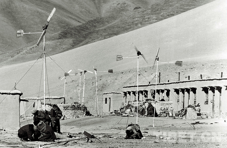 這是那曲地區(qū)(現(xiàn)那曲市)風(fēng)能實驗站的技術(shù)工人在幫助嘎措鄉(xiāng)一村村民維修保養(yǎng)風(fēng)力發(fā)電機(唐召明1988年攝)