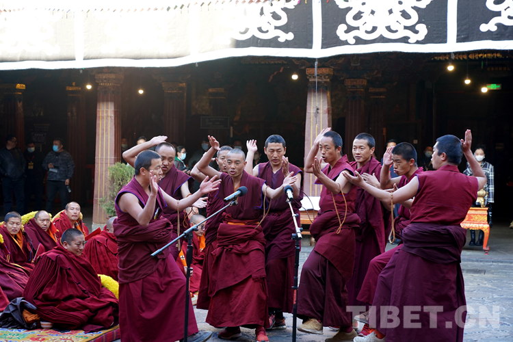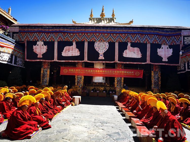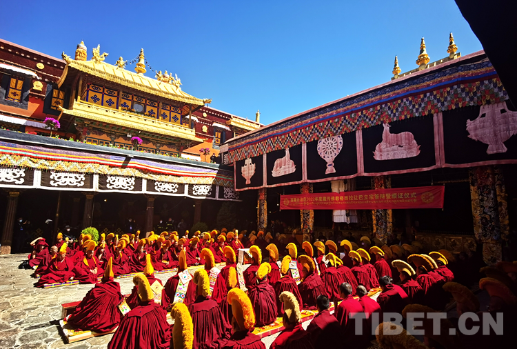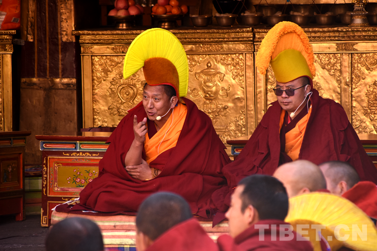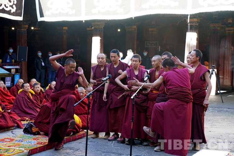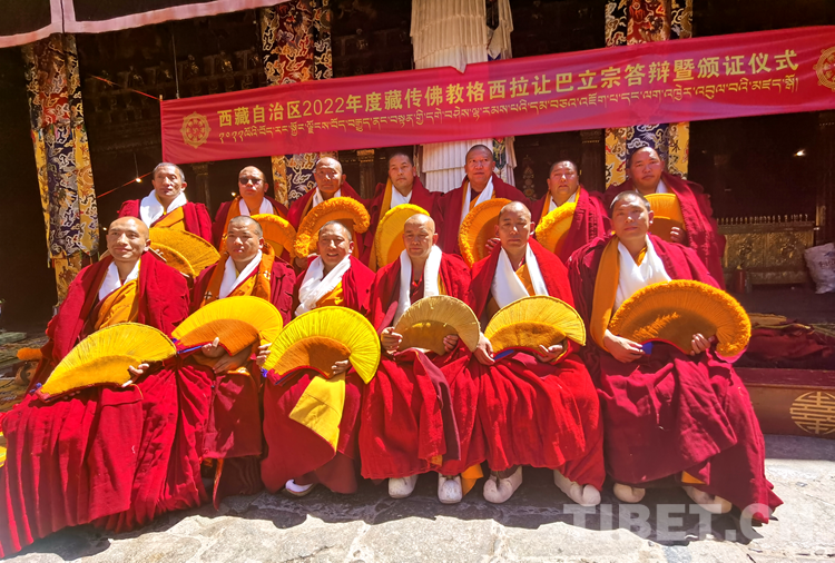 圖為西藏自治區(qū)2022年度藏傳佛教學(xué)經(jīng)僧人考核晉升格西拉讓巴學(xué)位立宗答辯暨頒證儀式現(xiàn)場 攝影:拉姆