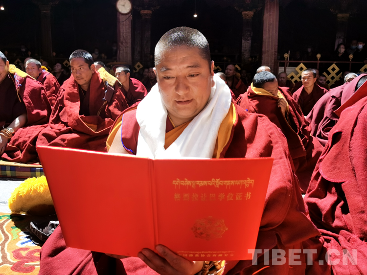 活動現(xiàn)場,西藏自治區(qū)人民政府副秘書長馬立柱代表西藏自治區(qū)人民政府向獲得學(xué)位的考僧贈送五彩緞、干果、袈裟和禮金;西藏自治區(qū)宗教局副局長達娃窮達向參加答辯活動的僧人發(fā)放布施;中國佛教協(xié)會西藏分會常務(wù)副會長、西藏佛學(xué)院院長珠康?土登克珠致賀詞,并代表班禪額爾德尼?確吉杰布會長向獲得學(xué)位的考僧獻哈達、頒發(fā)學(xué)位證書。