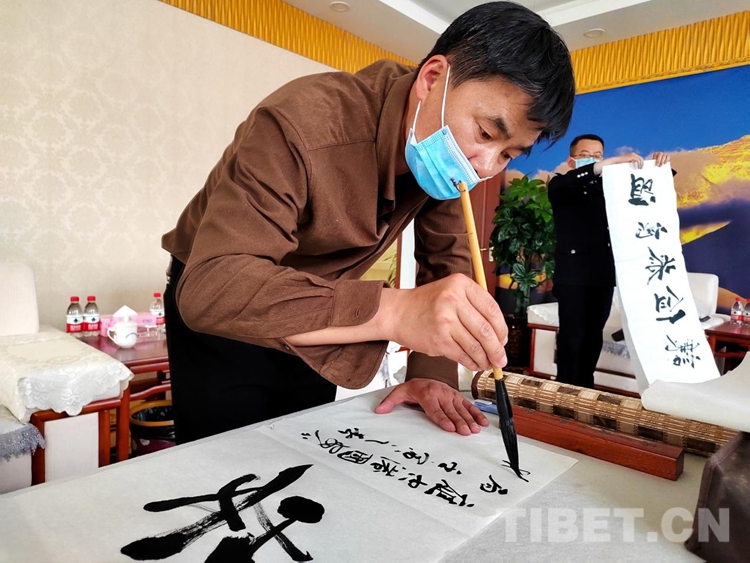 活動邀請的西藏自治區(qū)文聯(lián)3名書法家在現(xiàn)場潑墨揮毫。在場民警們紛紛在佳作前駐足欣賞,細細品味,感受到了筆墨之美,并與書法家們面對面交流,虛心求教。此外,西藏自治區(qū)文聯(lián)贈送四幅書法作品以示祝賀。