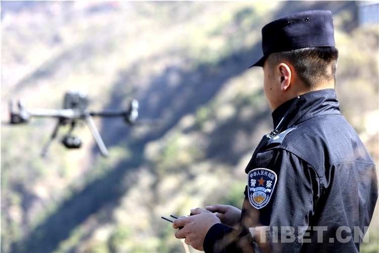 圖為民警利用無人機(jī)對波曲河道兩翼滑坡地段進(jìn)行勘測 攝影:鄒興國