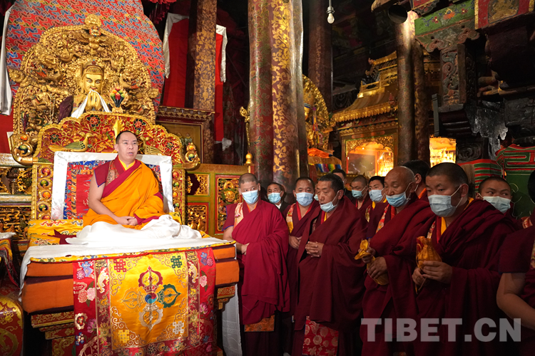 位于大殿東側(cè)正中的主殿,供奉有唐代文成公主帶入雪域高原的釋迦牟尼十二歲等身佛像。班禪入內(nèi),虔誠(chéng)而莊重地向佛像叩頭朝拜、敬獻(xiàn)哈達(dá)。隨后登上法座,在領(lǐng)經(jīng)師的伴誦下帶領(lǐng)眾僧誦經(jīng),祈愿國(guó)泰民安、世界和平、風(fēng)調(diào)雨順、人類遠(yuǎn)離疫情、消災(zāi)祛難。集體誦經(jīng)結(jié)束后,班禪為大昭寺眾僧摸頂賜福并發(fā)放布施。