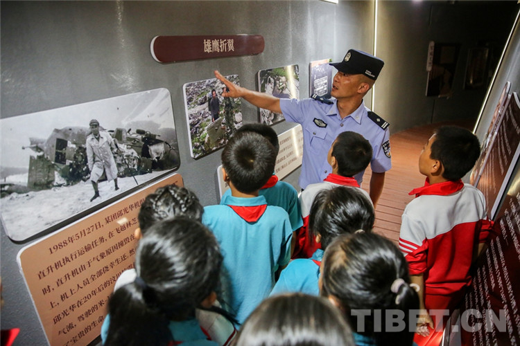 圖為背崩邊境派出所民警在戰(zhàn)斗坑道教育長廊中向?qū)W生介紹墨脫邊境發(fā)展歷史