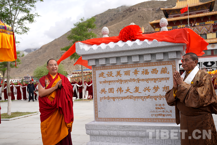 圖為班禪為西藏佛學(xué)院“建設(shè)美麗幸福西藏 共圓偉大復(fù)興夢想”石碑揭牌 攝影:王淑