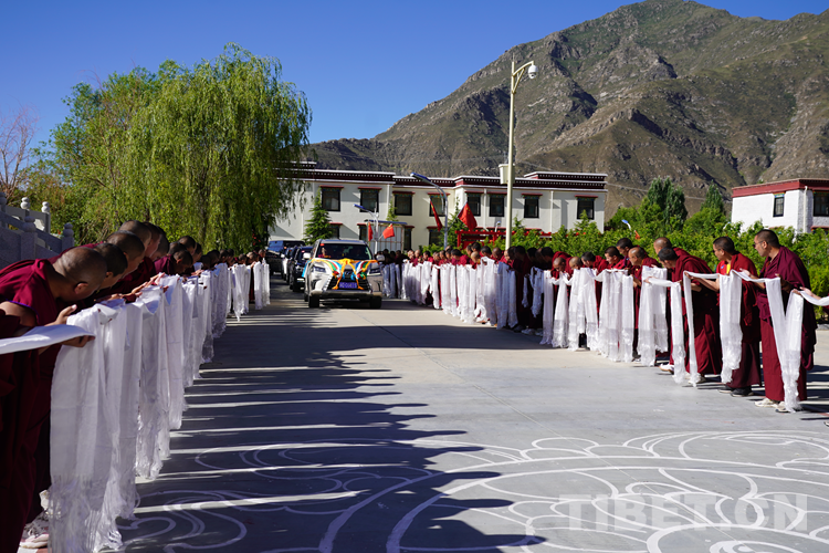 圖為班禪抵達西藏佛學(xué)院并向僧眾致意 攝影:王淑