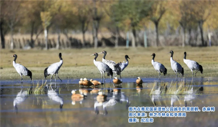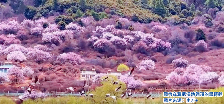 雅尼濕地生態(tài)的改善,不僅解決了困擾當(dāng)?shù)厝罕姸嗄甑娘L(fēng)沙問題,而且其高原濕地獨特的壯美景觀吸引了大批慕名而來的游客。這里已成為著名的林芝桃花的最佳觀賞地之一,尤其是黑頸鶴在此停留之時,正是桃花盛開之際,灼灼其華間清啼入云,桃紅緋然間鶴舞翩躚的勝景是大自然對這里的人們矢志保護(hù)生態(tài)的回饋,更是整個西藏自治區(qū)著力生態(tài)保護(hù)成效的縮影。