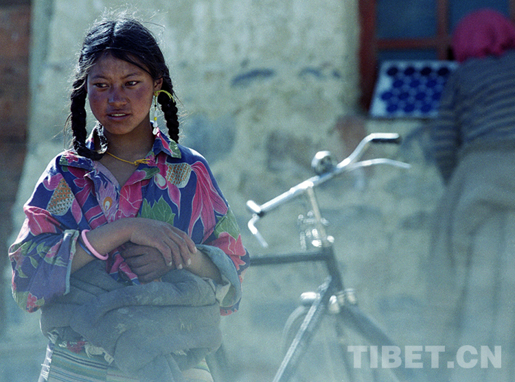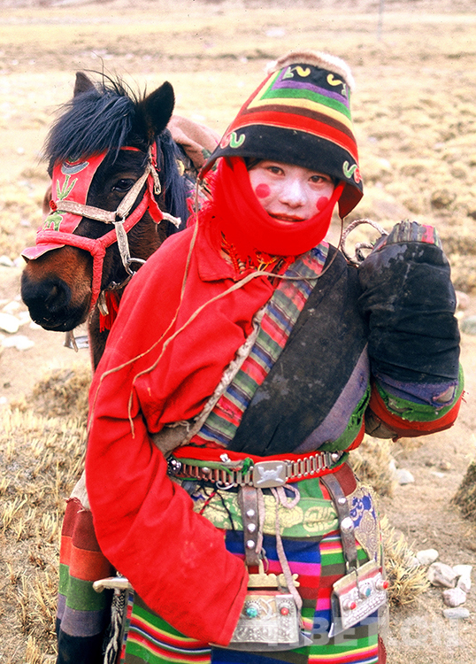 這是藏北申扎縣一位出行的牧女,使用紅顏料在臉頰涂上圓圓的“高原紅”,來作為美的印記(唐召明1991年攝)