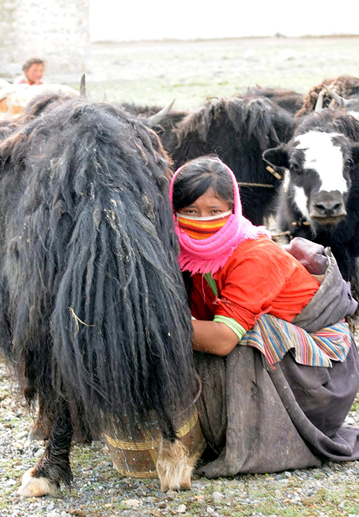 這是藏北申扎縣申扎鎮(zhèn)三村戴著防曬口罩和圍巾擠牦牛奶的青年牧女(唐召明2009年夏攝)