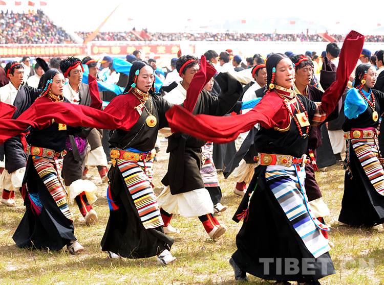 這是在藏北首府那曲鎮(zhèn)舉辦的草原賽馬盛會(huì)上,如今沒有了“高原紅”的藏族婦女在跳大型“鍋莊舞”(唐召明2013年8月10日攝)