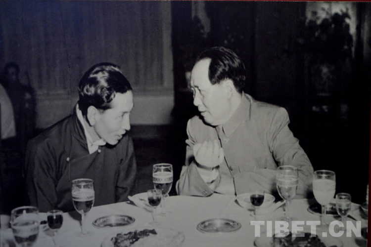圖為1951年5月24日,毛澤東主席設宴慶?!吨醒肴嗣裾臀鞑氐胤秸P于和平解放西藏辦法的協(xié)議》的簽訂。宴會上,毛主席與阿沛?阿旺晉美(左)親切交談