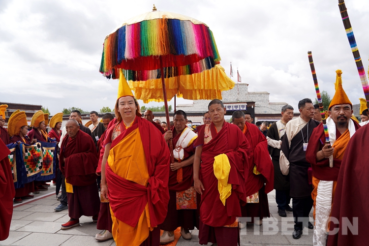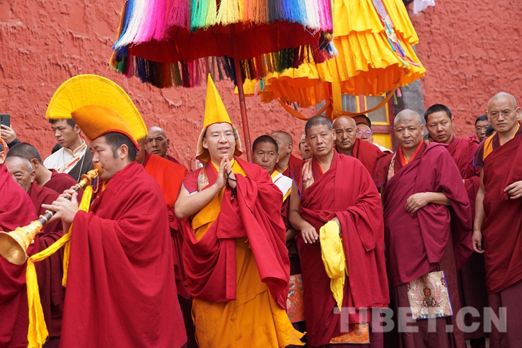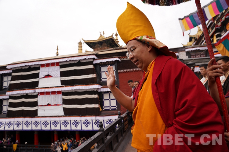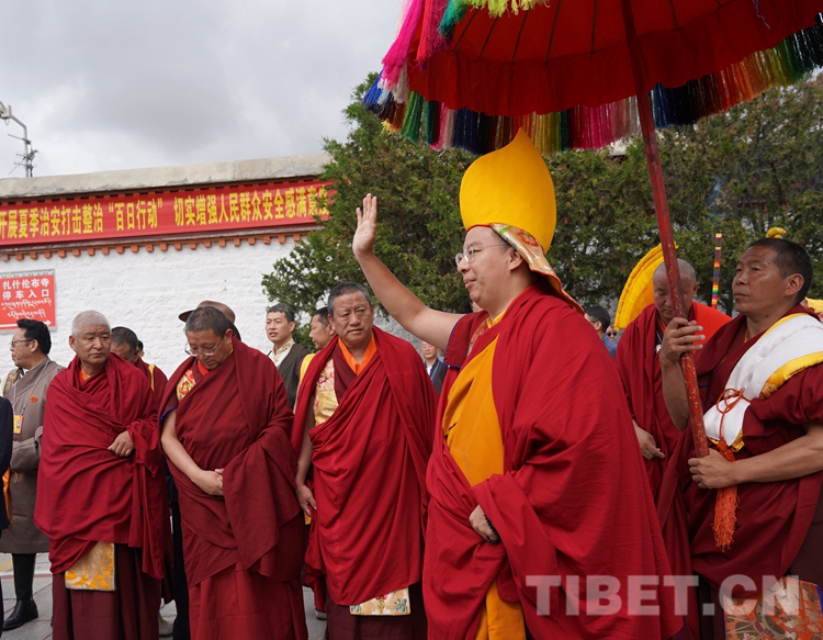 班禪抵達(dá),現(xiàn)場(chǎng)桑煙繚繞,法號(hào)聲悠長(zhǎng),扎什倫布寺僧眾以藏傳佛教最高禮儀迎接班禪。現(xiàn)場(chǎng)等候班禪的信教群眾紛紛摘帽行禮或雙手合十,向班禪的到來(lái)表示熱烈歡迎,班禪見(jiàn)狀揮手致意、送上祝福。隨后,班禪在手持黃傘、香爐的高僧引領(lǐng)下緩緩步行至措欽大殿。