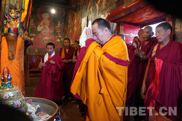 在措欽大殿,班禪虔誠(chéng)叩拜供奉于此的佛祖釋迦牟尼佛像和藏傳佛教格魯派始祖宗喀巴塑像,與眾僧共同念誦經(jīng)文后,回到寢宮拉讓殿。下午,班禪登上拉讓日光殿寶座,接受扎什倫布寺管委會(huì)僧人成員、高僧朝拜,并為他們摸頂賜福,帶領(lǐng)高僧誦經(jīng)祈福。
