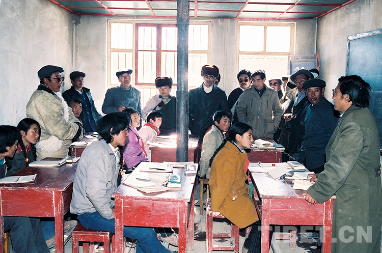 這是那曲地區(qū)“訪(fǎng)問(wèn)團(tuán)”人員在參觀(guān)文部辦事處小學(xué)(唐召明1989年12月份攝)