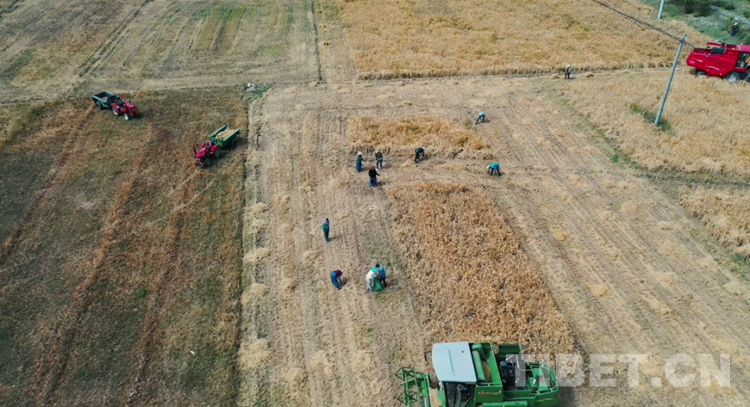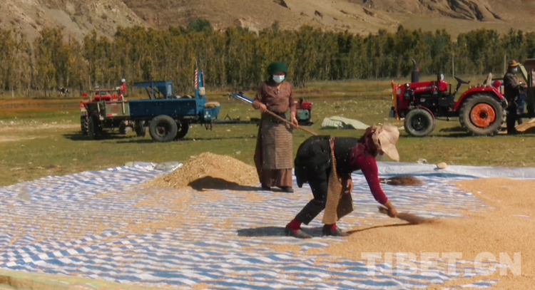 在達孜區(qū)雪鄉(xiāng)扎西崗村,隨著機器轟鳴,一顆顆金色飽滿的青稞粒構成一扇彩虹門,有人在曬青稞、有人在裝袋、有人在搬運,一幅和諧的秋收圖展現(xiàn)在眼前。