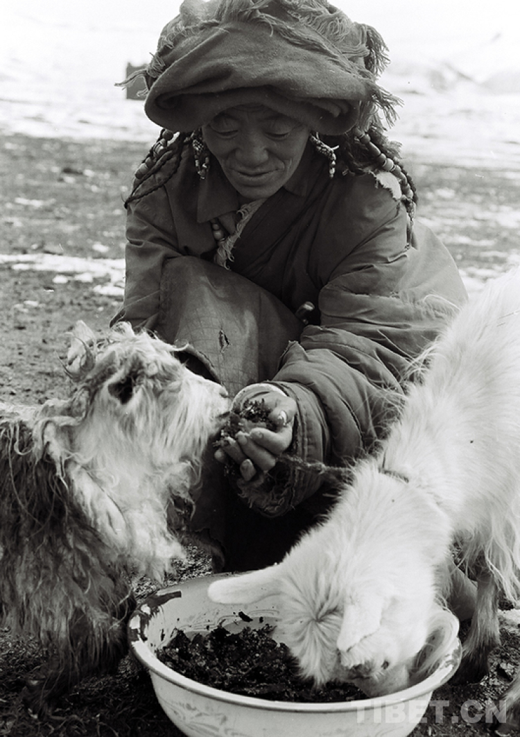 這是巴青縣一位牧女在雪災(zāi)中為饑餓的幼畜進(jìn)行補(bǔ)飼,以減輕自然災(zāi)害所造成的損失(唐召明1990年攝)