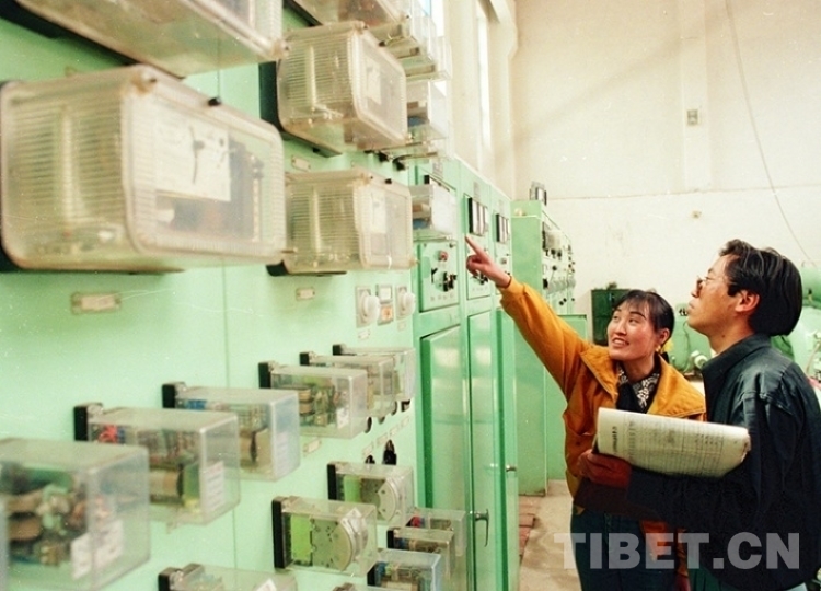 這是巴青縣水電站機(jī)房人員在工作。該水電站由吉林省所援建(唐召明1997年攝)