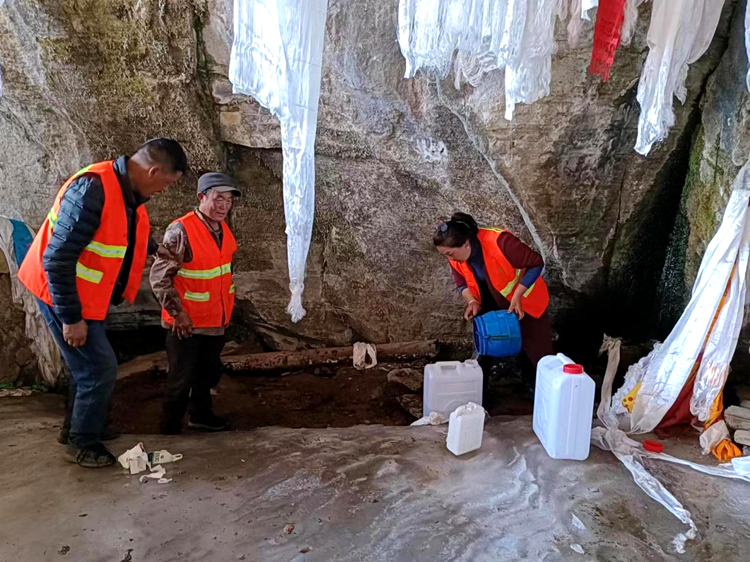 圖為亞夏帶領(lǐng)村護林員深入扎貢溝收集水源
