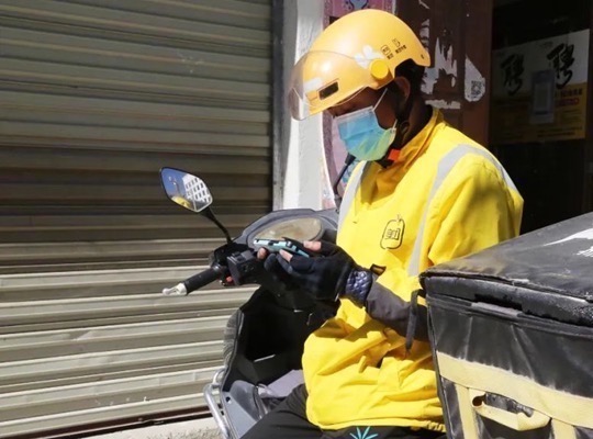 圖為山南市一名外賣騎手在收聽收看黨的二十大開幕盛況