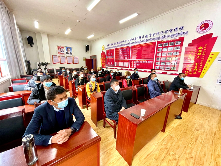 圖為山南市隆子縣玉麥鄉(xiāng)干部集中收聽收看黨的二十大開幕盛況
