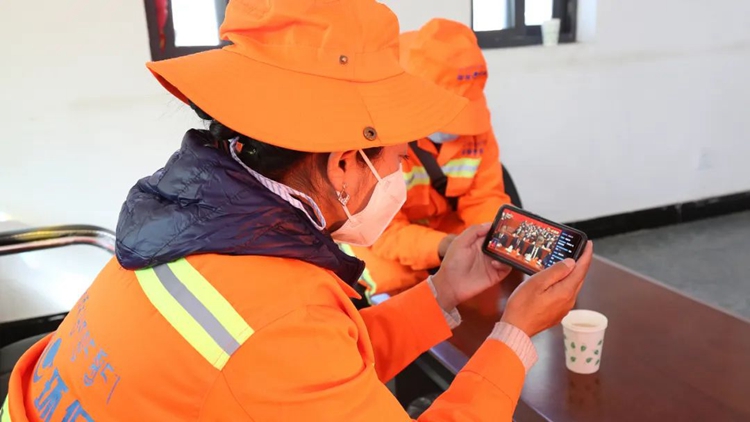 圖為山南市環(huán)衛(wèi)工人在收聽收看黨的二十大開幕盛況。
