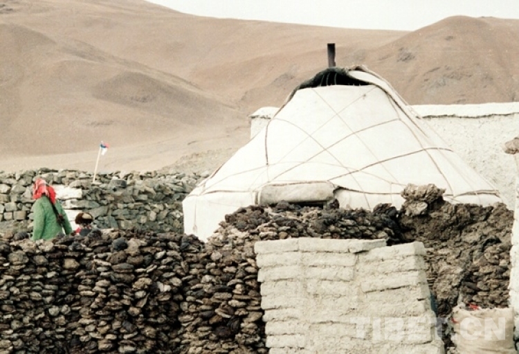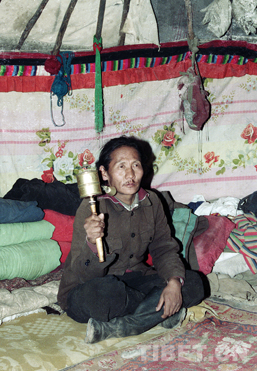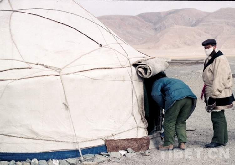 這是從新疆回遷到雙湖辦事處榮瑪鄉(xiāng)(現(xiàn)尼瑪縣榮瑪鄉(xiāng))的一位居住在蒙古包里的牧民群眾(唐召明1990年1月攝)