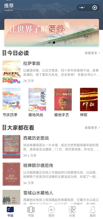 “掌讀西藏”為讀書公益類平臺(tái),免費(fèi)向讀者提供中國(guó)西藏主題的電子圖書。目前有《古格王國(guó)》《神歌》《達(dá)賴?yán)镛D(zhuǎn)世制度》《班禪額爾德尼傳》《拉薩掌故》《雪域山水藏地人》《節(jié)慶四季》《西藏歷史圖說(shuō)》《進(jìn)軍西藏日記》等29本電子圖書。這些電子圖書都是作者寶貴的知識(shí)結(jié)晶,也是對(duì)中國(guó)西藏珍貴的歷史記憶,濃縮了幾代人見證中國(guó)西藏發(fā)展的時(shí)代烙印。