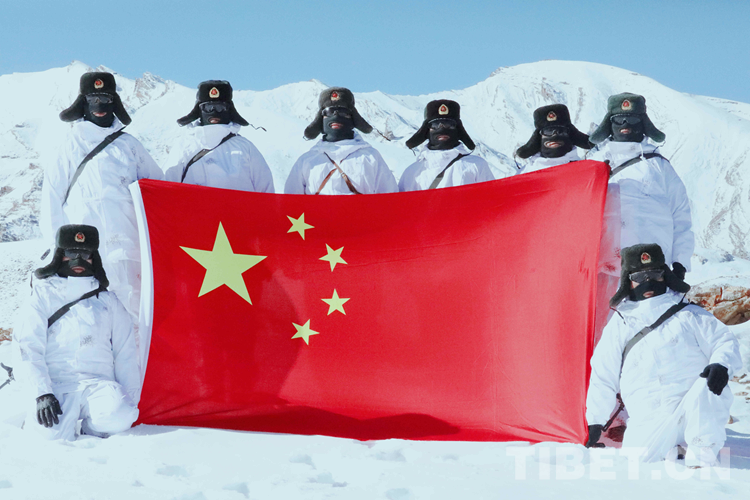 圖為阿里軍分區(qū)某邊防團官兵在巡邏路上展示國旗 攝影:劉曉東