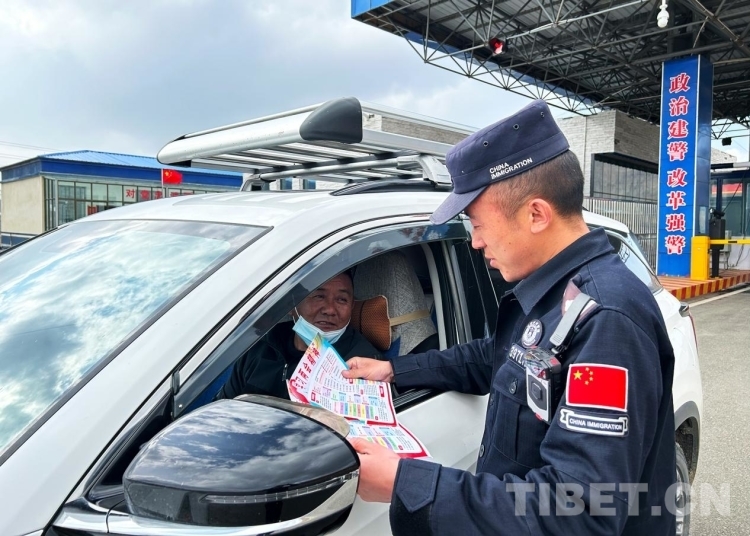 圖為錯那邊境檢查站執(zhí)勤民警為過往旅客發(fā)放宣傳單